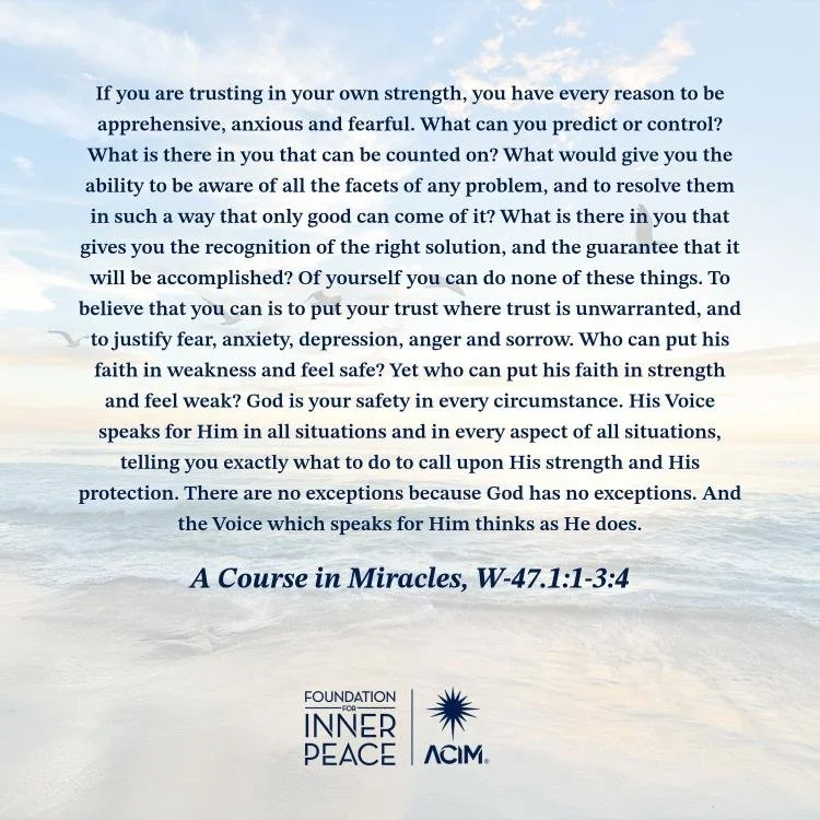 God holds your future as He holds your past and present. ²They are one to Him, and so they should be one to you. ³Yet in this world, the temporal progression still seems real. ⁴And so you are not asked to understand the lack of sequence really found in time. ⁵You are but asked to let the future go, and place it in God’s Hands. ⁶And you will see by your experience that you have laid the past and present in His Hands as well, because the past will punish you no more, and future dread will now be meaningless. W-194.4:1-6